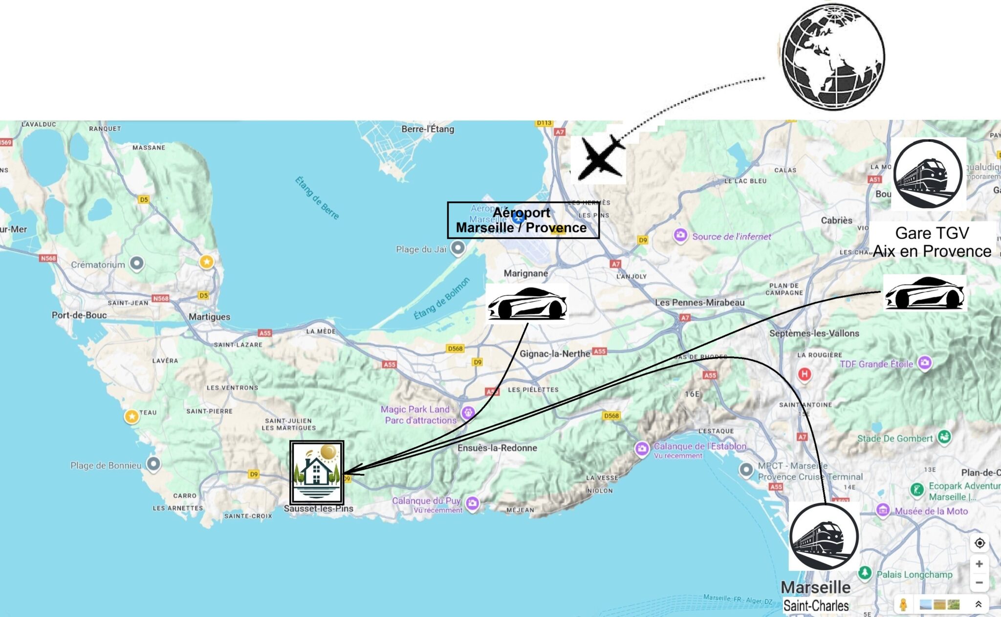 – En avion : L’aéroport Marseille-Provence se situe à seulement 23 km de Sausset.